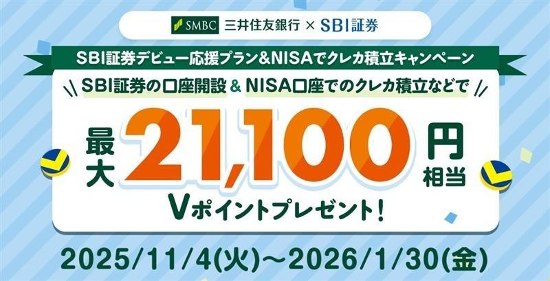 この度、2025年11月4日(火)~2025年11月14日(金)の期間、最大25,100円相当の特典を受け取れるチャンスが到来しました。期間中に、SBI証券の新規口座開設、NISA口座でのクレカ積立などの条件を満たすと、Vポイントなどの特典が獲得できるというものです。