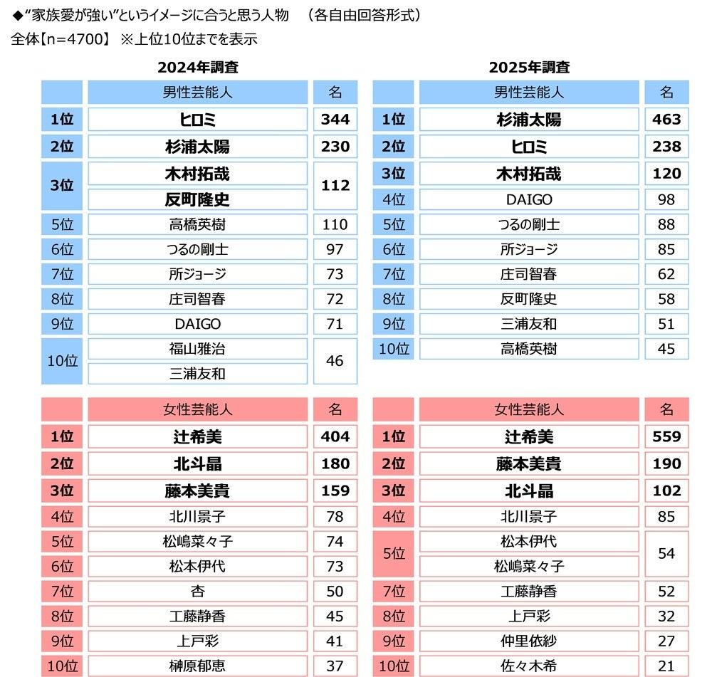 また、家族愛が強いと思う芸能人では、杉浦太陽さんと辻希美さん夫妻がそろって1位となりました。さらに、家族愛が強いスポーツ選手では大谷翔平さんと浜口京子さんがそれぞれ1位に選ばれました。
