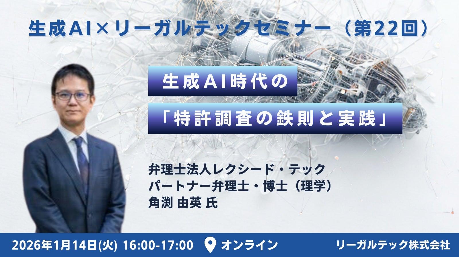リーガルテック株式会社は、2026年1月14日(水)16時よりオンラインで「知財×AIリーガルテックセミナー(第22回)」を開催します。