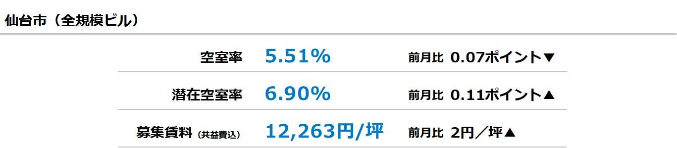 仙台市のオフィス空室率は前月比マイナス0.07ポイントの5.51%となり、3か月連続の低下傾向にあります。