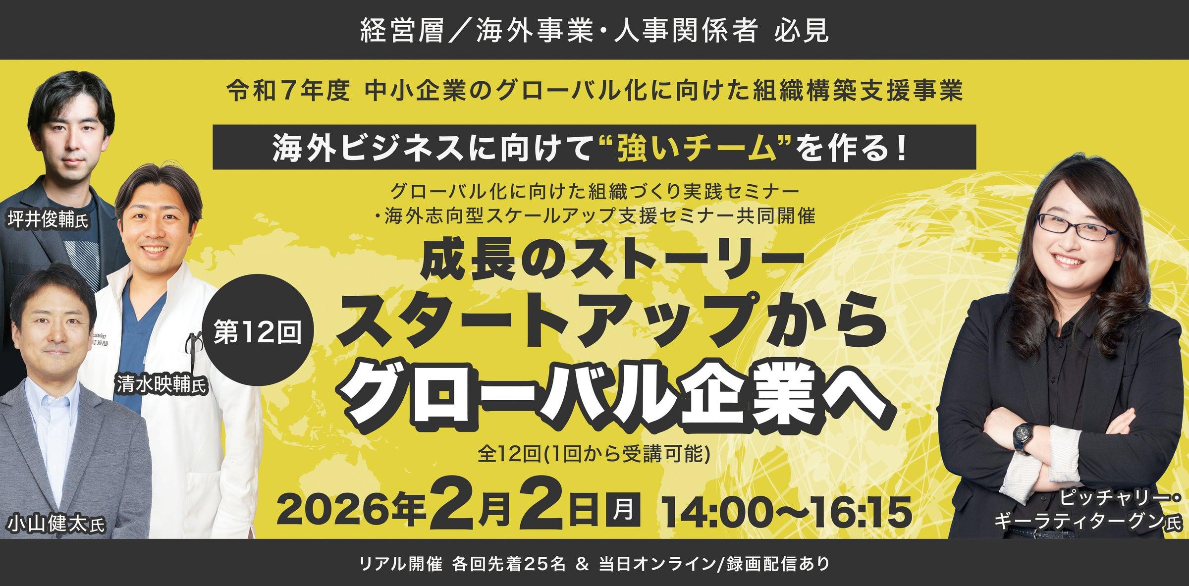 このたび公益財団法人 東京都中小企業振興公社が主催する「グローバル組織づくり実践セミナー」の第12回目が開催されます。テーマは「成長のストーリー スタートアップからグローバル企業へ」で、経営層や海外事業・人事担当者を対象に、グローバル化に向けた組織づくりや人材育成について学べる内容となっています。