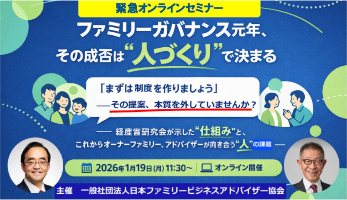 本セミナーでは、制度論にとらわれがちなガバナンス議論を一段深め、ファミリービジネスの現場で本当に起きている課題や、必要とされる人材像を明らかにしていくことが期待されます。中堅・同族企業にとって大きな示唆を与える内容となりそうです。