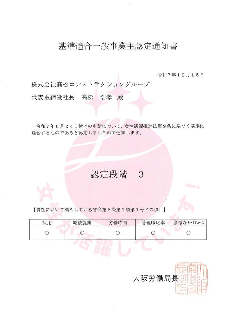 - 株式会社高松コンストラクショングループが、女性活躍推進法に基づく「えるぼし認定(3つ星/3段階目)」を取得