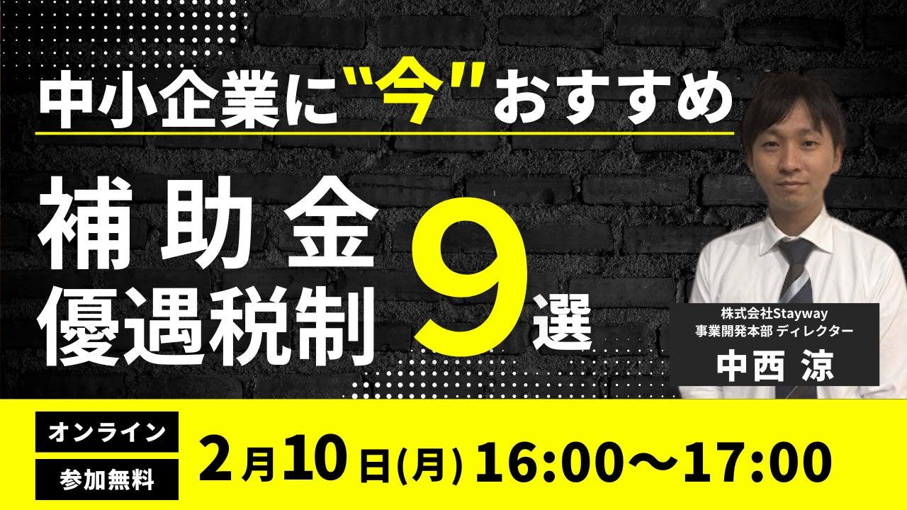 株式会社Staywayは、2026年2月10日(火)16:00~17:00に、中小企業向けの無料オンラインセミナー「【2/10(火)16:00~17:00】中小企業に”今”おすすめの補助金・優遇税制9選」を開催する予定です。