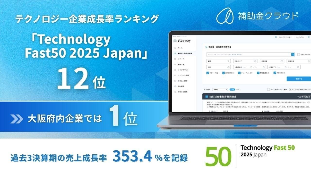 • 補助金クラウドを運営する株式会社Stayway が、テクノロジー企業成長率ランキング「Technology Fast 50 2025」で12位を受賞