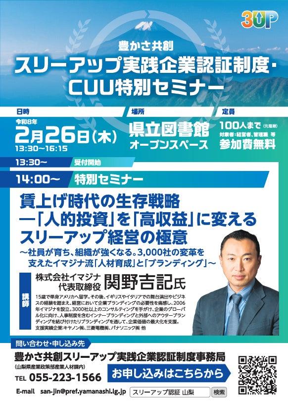 株式会社イマジナは、2026年2月26日(木)に山梨県立図書館で、「賃上げ時代の生存戦略 ―『人的投資』を『高収益』に変えるスリーアップ経営の極意」と題したセミナーを開催します。