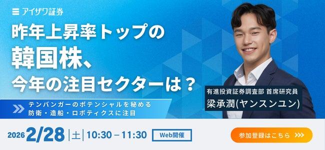アイザワ証券株式会社は、2026年2月28日(土)に、成長が期待される防衛・造船分野を中心に韓国株の見通しについて解説するWebセミナーを開催する。