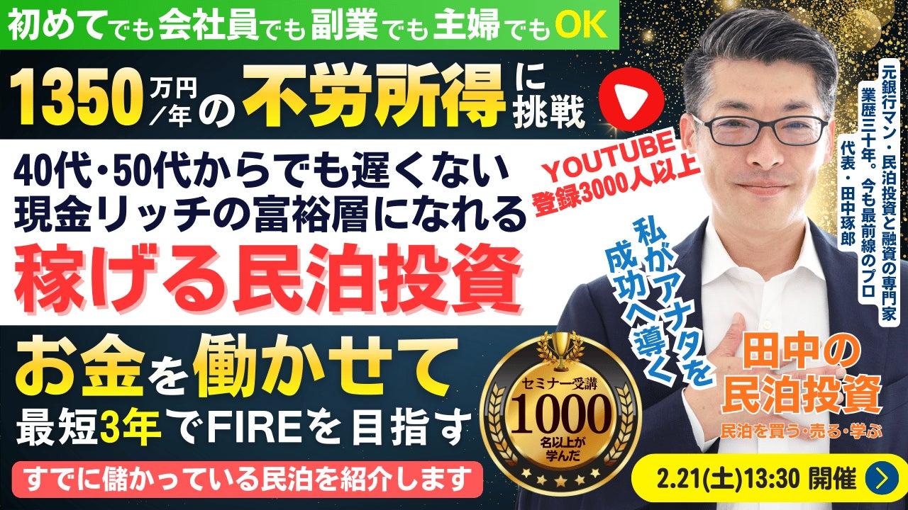 セミナーでは、会社員や公務員などの40代・50代の方でも最短3年でFIREを目指せるキャッシュリッチな民泊投資の具体的な方法を解説します。講師は、『稼げる民泊YouTube』の登録者が3000人を超える民泊投資・融資の専門家の元銀行マン・田中琢郎氏が務めます。