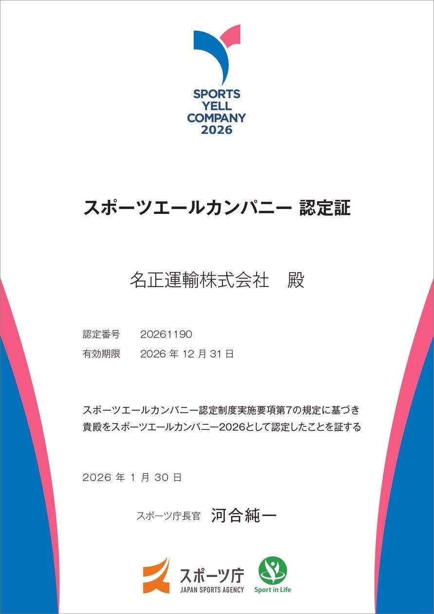 名正運輸株式会社は、スポーツ庁が実施する「スポーツエールカンパニー2026」において、認証の継続を発表しました。