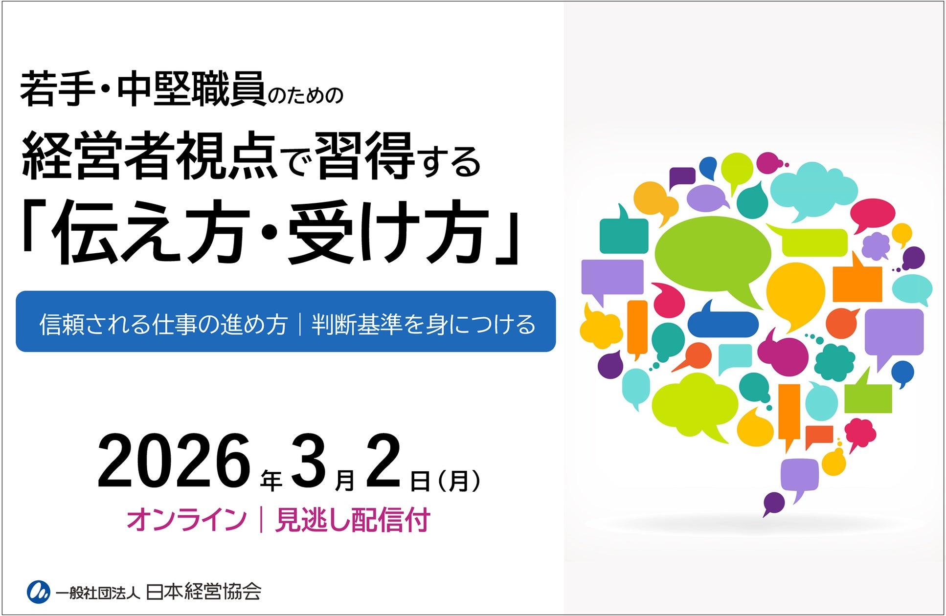 一般社団法人日本経営協会は、2026年3月2日(月)に、若手・中堅社員向けオンライン講座「経営者視点で習得する『伝え方・受け方』」を開催します。