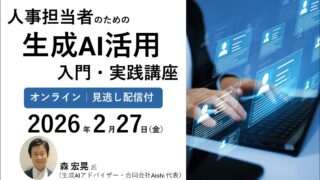 人事×生成AI活用セミナー:採用・育成・評価・労務における使い方と判断力を学ぶオンライン講座【見逃し配信付】 ニュースの要約人事担当者向けに、生成AIの活用方法を基礎から実践まで網羅するオンラインセミナーの開催採用、人材育成、評価、労務管理などの人事業務において、生成AIをどのように活用できるかを解説セミナーでは、生成AIの利活用に関するリスクや対... ニュース: 2026.01.22 ニュース