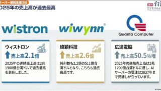 AIサーバ:AI サーバ生産売上高過去最高、莒光号2028年末引退、日系企業7社高雄市政府が表彰、台北市スモークフリー政策批判の声、ゴルフ会員権価格急騰【2026/01/19号】 ニュースの要約 AI(人工知能)サーバの受託生産大手3社の2025年売上高が過去最高を記録 台湾鉄道の「莒光号」が2028年末で引退する 高雄市政府が日系企業7社を表彰した概要台湾のAI(人工知能)サーバの受託生産大手3社、ウィストロ... ニュース: 2026.01.20 ニュース