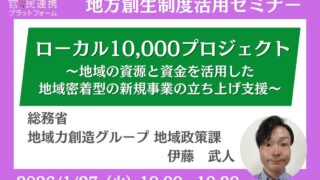地域経済循環創造事業補助金(ローカル10,000プロジェクト):総務省担当者登壇!1/27(火)オンラインセミナー開催のお知らせ ニュースの要約総務省が地域密着型の新規事業立ち上げ支援制度「ローカル10,000プロジェクト」の概要を説明するオンラインセミナーを開催補助金の対象となる事業や活用方法、実際の支援の流れなどが詳細に紹介される地域の資源と資金を活用した新規事業... ニュース: 2026.01.16 ニュース