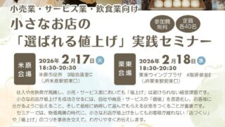 価格転嫁セミナー:滋賀県商工会連合会が2/17米原・2/18栗東で小売業・サービス業・飲食業向けの開催 ニュースの要約 滋賀県商工会連合会が、小売業・サービス業・飲食業向けの「価格転嫁セミナー」を2月に開催 背景には、仕入れや光熱費、人件費の高騰により、事業者が値上げを余儀なくされていることがある セミナーでは、物価高騰の時代に小規模事... ニュース: 2026.01.16 ニュース