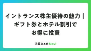 イントランス株主優待の魅力|ギフト券とホテル割引でお得に投資 イントランス(証券コード:3237)の株主優待は、デジタルギフト券とホテル宿泊割引券がもらえる魅力的な制度です。この優待は、3月末と9月末の権利確定日に1,000株以上保有する株主を対象としており、年間で合計5,000円相当のデジタルギフト... 決算書: 2026.03.20 決算書