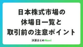 日本株式市場の休場日一覧と取引前の注意ポイント 日本株式市場は、国民の祝日を中心に決まった休場日が設定されており、これらを事前に把握することでスムーズな資産運用が可能になります。この記事では、2026年の日本株式市場の休場日を詳細にまとめ、投資家の方々が効率的に取引計画を立てられるよう役... 決算書: 2026.03.27 決算書
