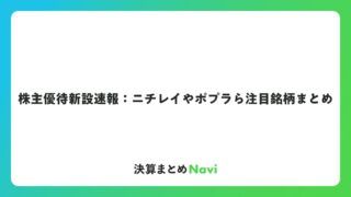 株主優待新設速報:ニチレイやポプラら注目銘柄まとめ 株主優待の新設情報は、投資家にとって注目度の高いトピックです。最近の発表では、さまざまな企業が株主還元を強化する形で新しい優待制度を導入しており、株主とのつながりを深める取り組みが活発化しています。この記事では、最新... コラム: 2026.01.26 コラム
