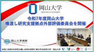 【岡山大学橋渡し研究支援拠点】:令和7年度 岡山大学橋渡し研究支援拠点外部評価委員会を開催 ニュースの要約 岡山大学が2025年12月22日に、令和7年度の岡山大学橋渡し研究支援拠点外部評価委員会を開催しました。 外部評価委員会では、採択シーズにおけるモダリティ動向の分析や、生成AI活用の可能性、AMED調整費獲得に向けた戦略... ニュース: 2026.01.24 ニュース