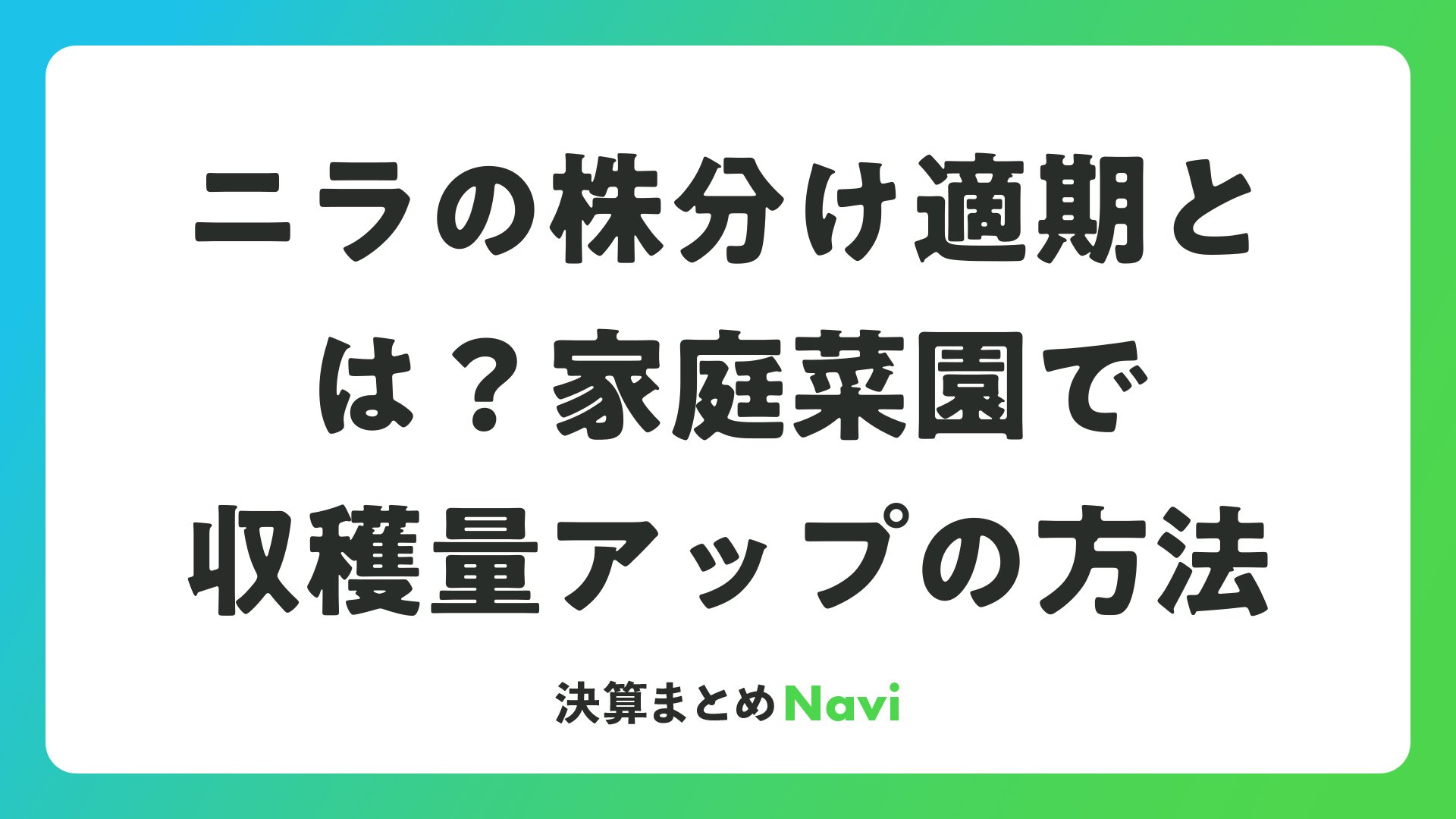 家庭菜園で人気のニラは、適切な株分け時期を選べば、まるで優良株のように長期的に安定した収穫をもたらします。この記事では、ニラの株分け時期に焦点を当て、投資家マインドで「リターン最大化」を目指した栽培法を解説します。株分けを定期的に行うことで、収穫量を増やし、栄養豊富な葉を効率的に得られるようになります。