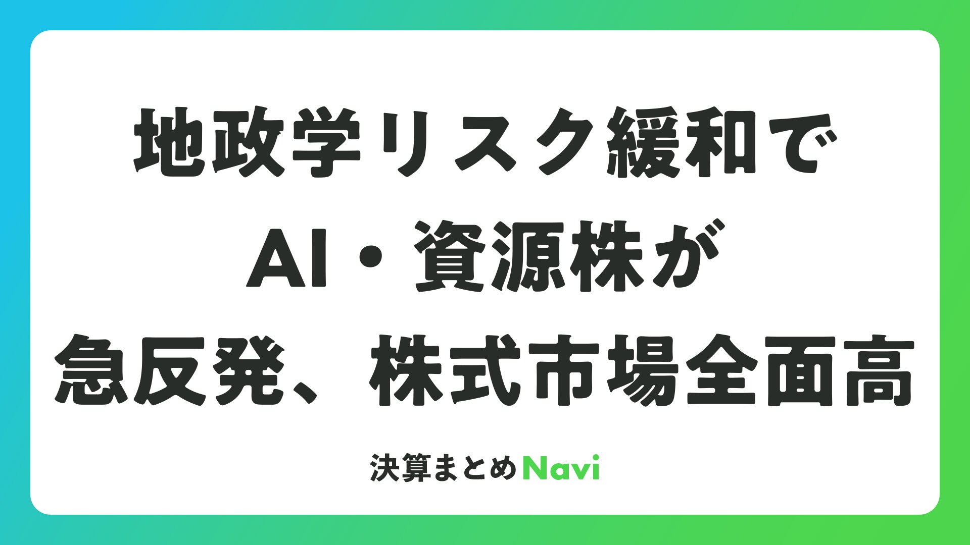 地政学リスク緩和でAI・資源株が急反発、株式市場全面高をまとめました