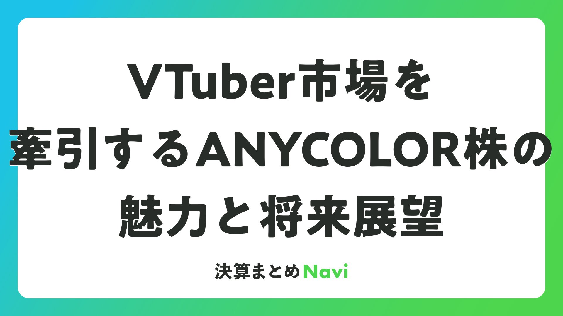 ANYCOLOR株式会社(証券コード:5032)は、VTuberグループ「にじさんじ」を運営するエンターテインメント企業として、株式市場で高い注目を集めています。この記事では、株式投資・資産運用を考える読者の皆さんに向けて、ANYCOLOR株の事業概要、業績推移、株価動向、投資指標、そして将来の見通しを詳しく解説します。VTuber市場の拡大を背景に、安定した成長を続ける同社の魅力をポジティブに探ります。